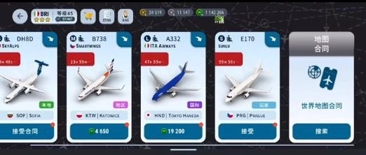 4、游戏内的合同包含本地、地区、国际、地图、随机玩家五种类型。本地合同仅能签约附近数量有限的机场,且通常只会刷新出S和M型飞机;不过它在合同界面无需绿币即可签署,每小时自动刷新一次,也可用100银币手动刷新。地区合同可签约的目的地有所增加,一般刷新的是M型飞机;从地区合同开始,签署就需要消耗绿币了,费用大概在5000绿币左右,刷新时间通常为20小时左右,也能花费1000银币刷新。升级到国际合同后,就能签约世界各地的合同,这里刷新的都是L型飞机和少量X型飞机,签署价格约15000绿币,刷新间隔大约45小时,还可以用200金币刷新。随机玩家合同刷新的都是其他玩家的飞机,机型种类不固定,随机出现;这类合同签署无需绿币,每小时刷新一次。世界合同则是供玩家签约各地合同的,不同机场的世界合同可签约的地点会存在一些差异。