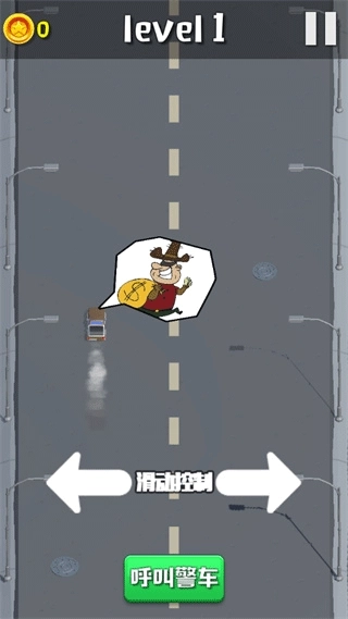 1、在屏幕上左右滑动手指,控制警车变换车道,避开障碍物。