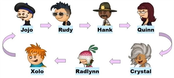 按照“最后一位顾客(closer)”的顺序表(见下图)来确定两人到来的日期,到达对应的日期后,先暂停进入顾客信息界面,查看这位顾客的点单内容,接着一开始就把面包炸好,等接到第六位顾客的订单后立刻制作,制作完成后再接单并马上提交,这个流程能够达成成就。
