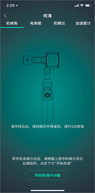 5、点击页面下方“校准”后按照图片指示说明依次进行校准,设备进入休眠状态,即可开始进行Roll轴、Pitch轴、Yaw轴3次校准,根据提示校准完成后,重新启动设备连接app即可使用。