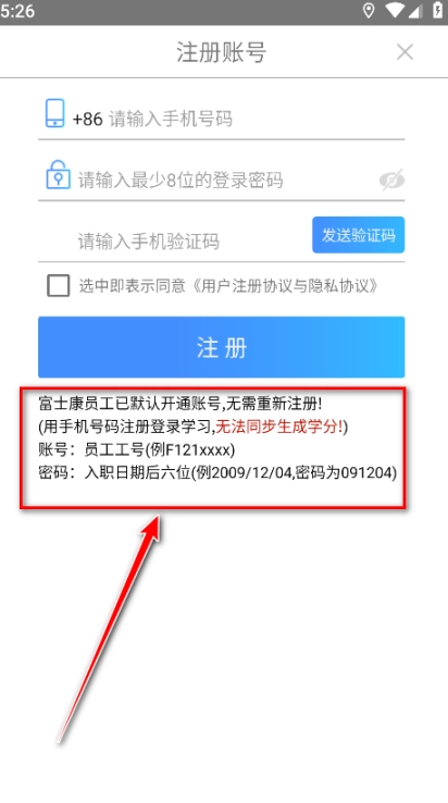 5. 若为富士康员工,账号已默认开通,无需重新注册。请仔细阅读并牢记下方红色框内的内容。