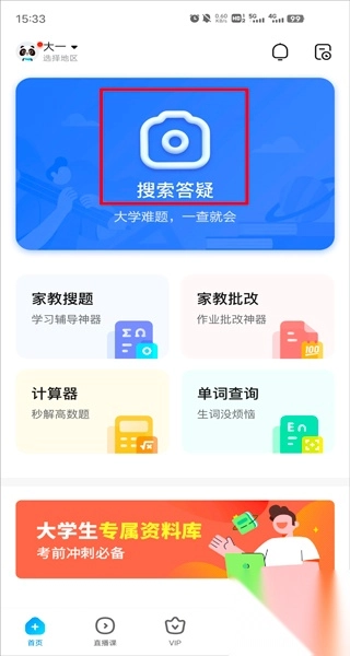 1、打开作业帮在线拍照解题,进入到首界面中之后,在该页面的正上方位置我们找到搜索答疑这个图标按钮,点击进入。