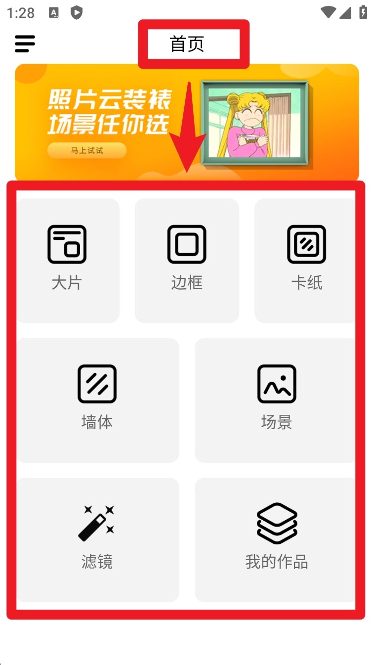 1. 当你进入首页,点击像「大片」「边框」「卡纸」等不同分类模块,从中挑选你心仪的装裱方式。