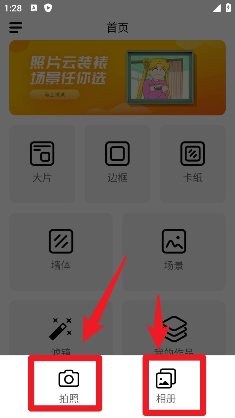 2. 系统会弹出选择图片来源的选项,你可点击「拍照」或者「相册」,导入想要装裱的照片,以便进行编辑。