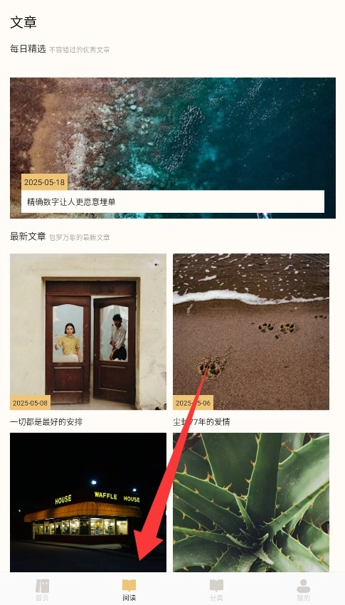 2、在底部导航栏选择"阅读"板块,即可浏览平台推荐的最新热门文章和书库内容。