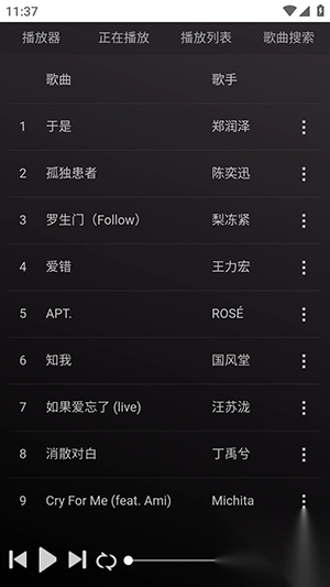 歌词同步:播放歌曲时,歌词实时滚动呈现,助您轻松跟唱或深入品味歌词意境。