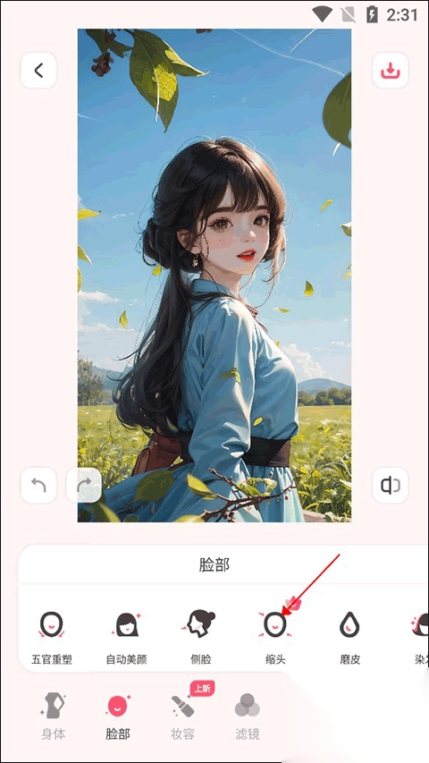3. 挑选出需要瘦身处理的照片,接着切换至脸部栏目,点击缩头功能。