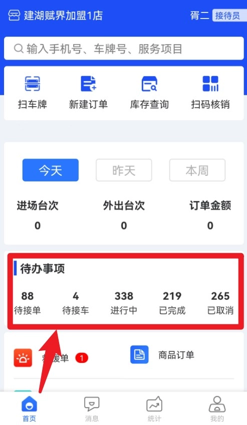 1、在首页可查看今日订单数据与待办事项统计信息分布情况。