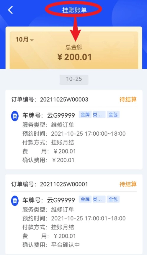 2. 点击“挂账账单”,即可查看每月尚未结算的订单以及与之对应的总金额记录。
