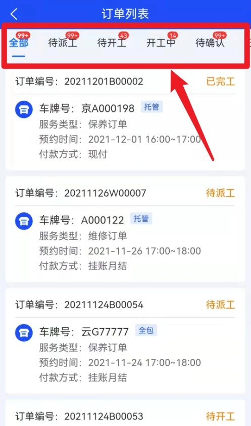 4、订单列表可依据派工、开工、确认等标签,实现各类订单的快速筛选。