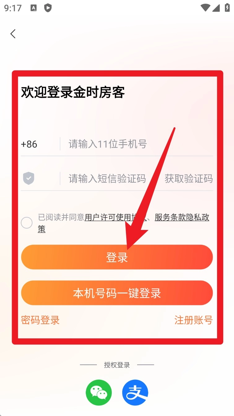 1. 金时房客首次使用时,进入注册界面,输入手机号,点击「获取验证码」,填写验证码,勾选协议,即可完成注册。