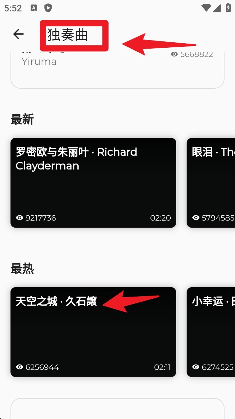 1. 打开 App 主页后,点击首页左侧的「独奏」模块,进入钢琴曲演奏分类列表。