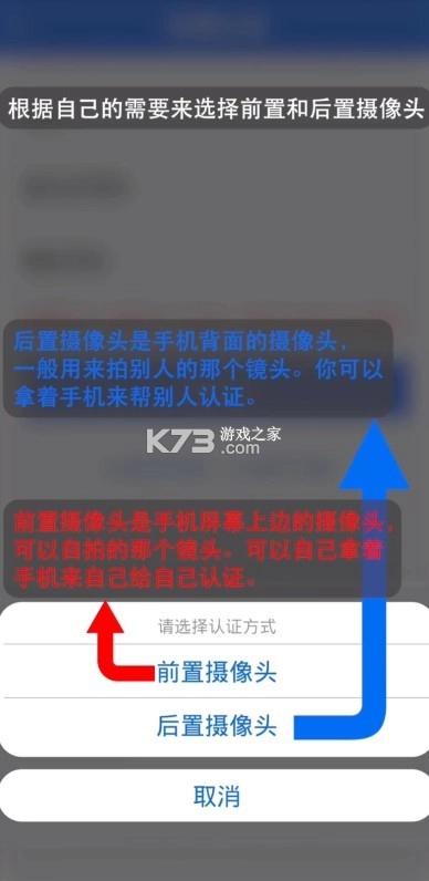 5.选择不同的认证方法,前置摄像头(手机屏幕字牌的镜头,支持自己给自己拍照认证),或者后置摄像头(手机背后的摄像头,让别人帮忙拍照认证);