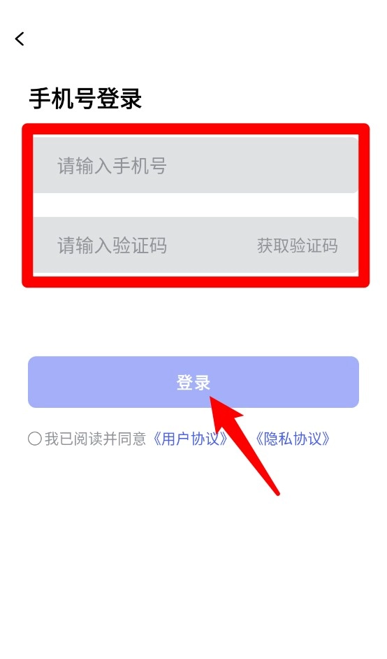 1、打开应用后进入手机号登录界面,输入手机号及验证码,再点击下方“登录”按钮完成验证。