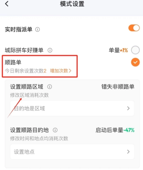 当您进入司机端的首页后,点击【模式】选项,接着在其子菜单中选择【顺路单】,随后就能依据自身需求对顺路区域以及顺路目的地进行设置。