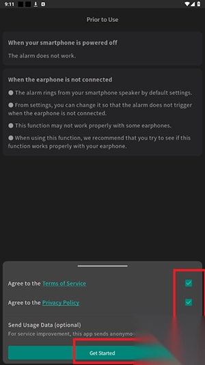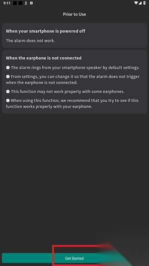 1、打开耳机闹钟app,点击开始使用