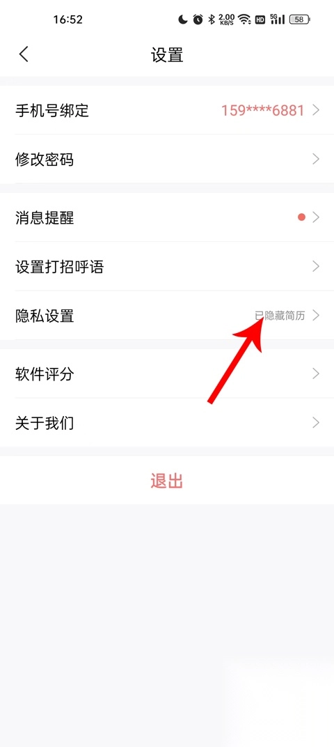 3、进入设置后,界面下方会呈现手机号绑定、修改密码、消息提醒、设置打招呼语、隐私设置等选项,此时我们点击隐私设置进入。