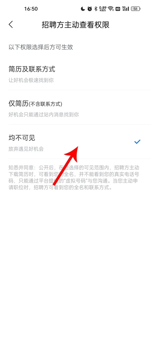 5、进入到智联招聘网招聘方主动查看权限中心之后,将其设置为均不可见,就可以隐藏简历信息了。