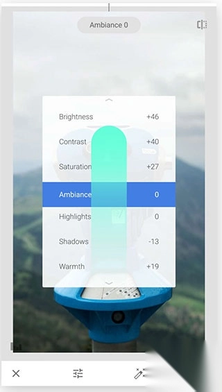 Snapseed 中的大多数调整都是这样工作的:在图像上垂直滚动以选择参数,然后水平滑动以更改参数值。