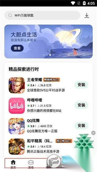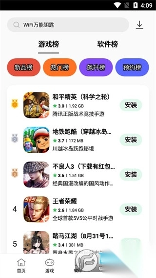 4、游戏板块就特别丰富了,分了新游戏、热门榜、网游榜等等,可以帮助爱玩游戏的小伙伴快速找到适合自己的游戏进行畅玩;