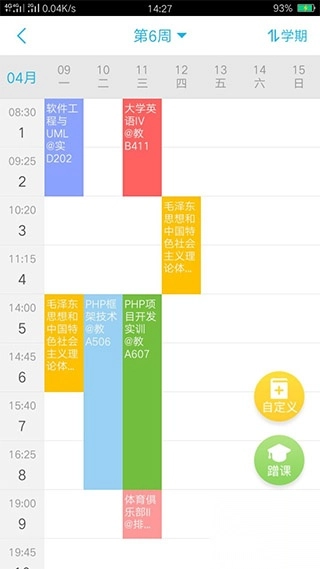 打开“我的课表”,点击“十”字符号,就会出现“自定义”和“蹭课”;