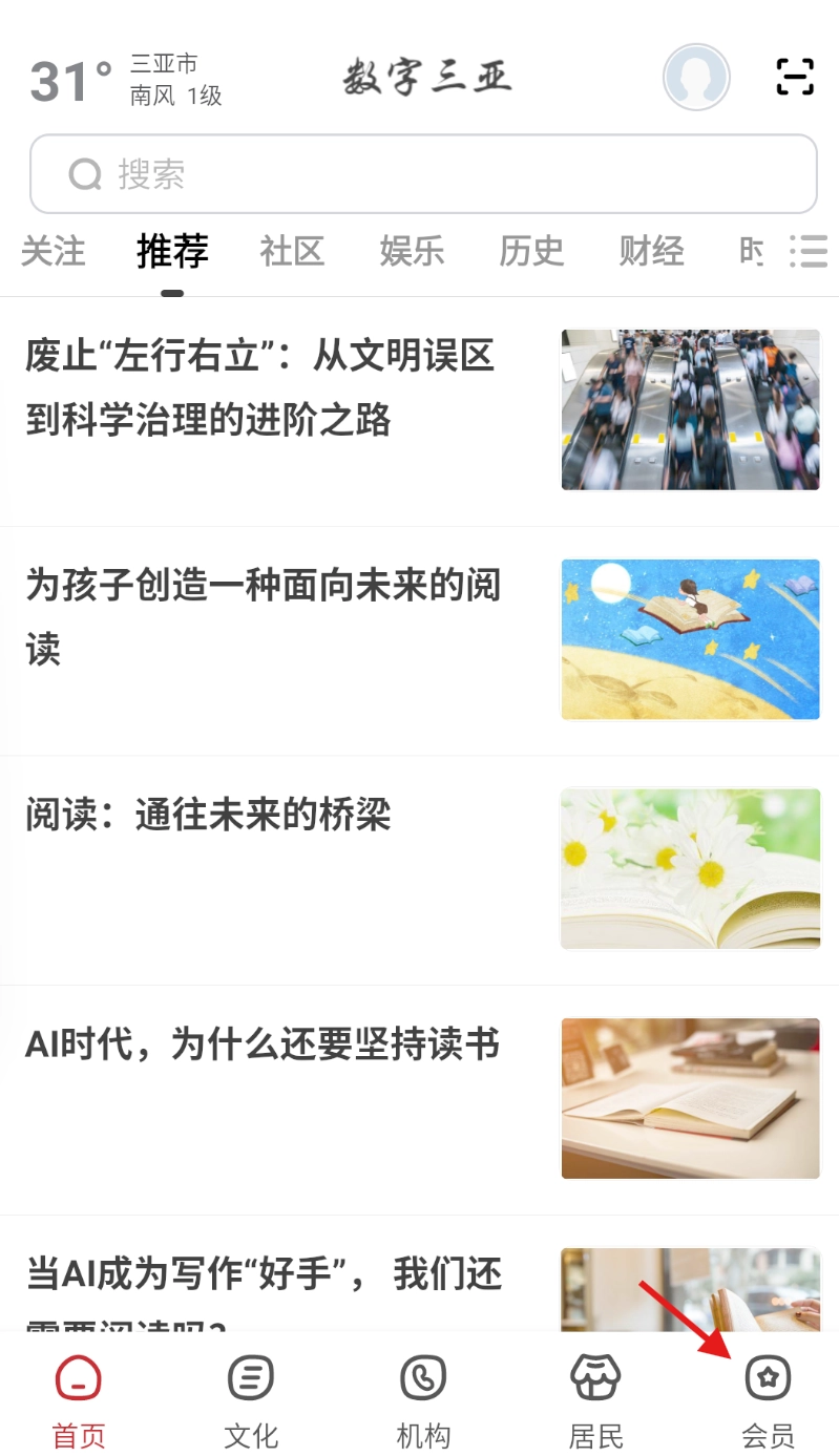1、打开数字三亚软件,在导航栏位置找到并点击 “会员” 选项。