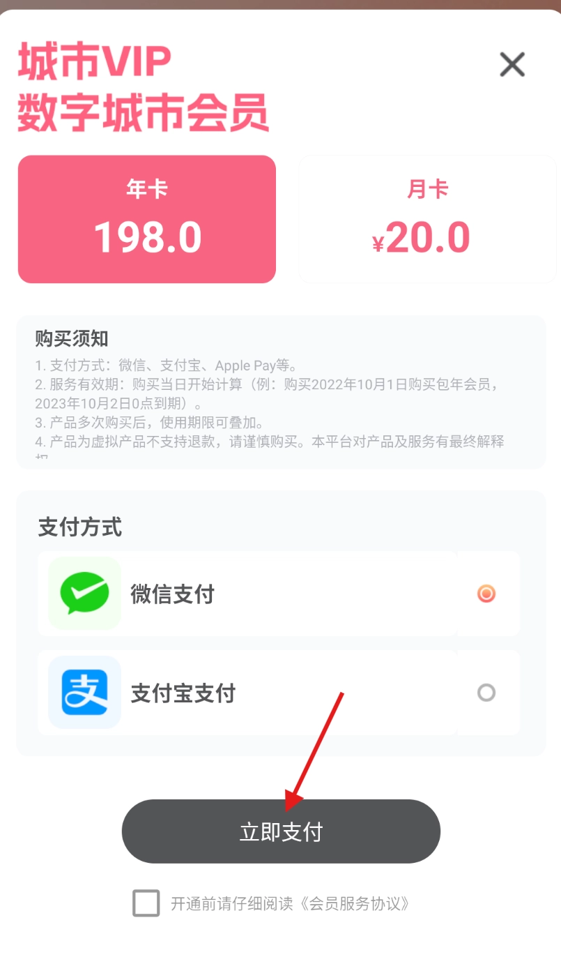 3、根据自身需求选择年卡或月卡,点击 “立即支付” 完成会员开通。
