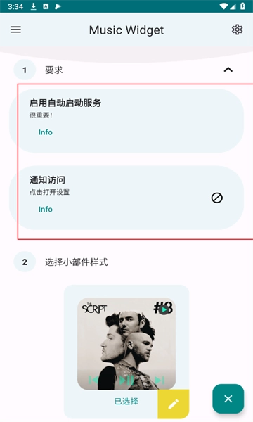 于本站下载Music Widget软件安装包,开启软件,对软件权限进行设置,赋予自启动与通知访问权限。