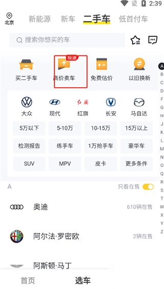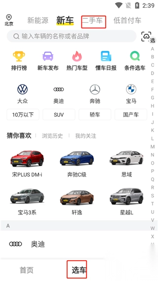 1. 打开软件,点击“选车 - 二手车”选项。