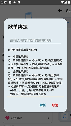 3、酷我歌单绑定,在歌单详情页面,点击分享,选择复制链接,回到觅音APP,粘贴复制的链接,点击解析即可,点击加号可以收藏解析的歌单。酷我,网易云,咪咕歌单绑定方法都一样