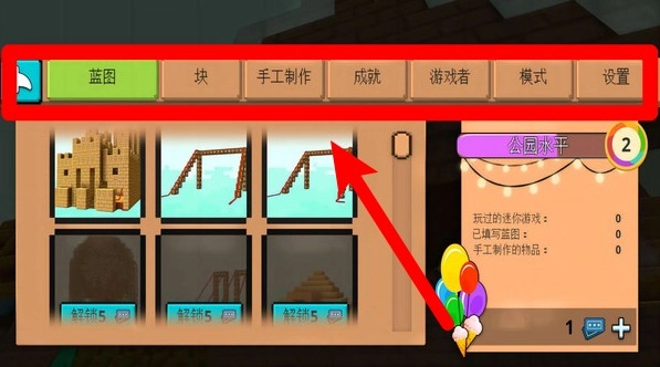 3. 轻点上方标签,即可选择不同功能区域,实现蓝图、块、手工制作等模式的自由切换。