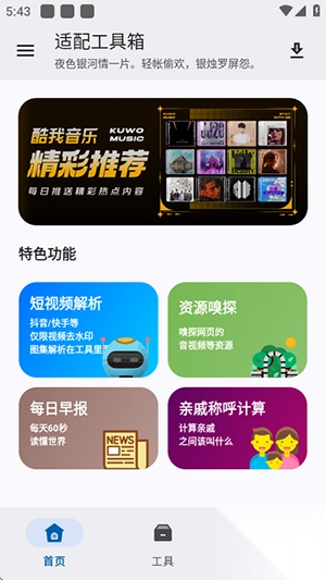 适配工具箱属于一款始终免费的综合性多功能工具软件,一经开启即可免费运用。该软件涵盖 7 大类别,融合了超百种实用性工具。并且具备特色功能模块,例如短视频内容解析、资源探寻嗅探、每日晨间资讯推送、亲属称谓计算等。