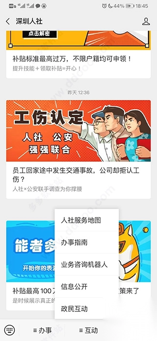 只需轻点公众号菜单栏里的“互动”选项,就能在线浏览深圳人社局的服务地图、办事指南,还有最新政策消息等内容。
