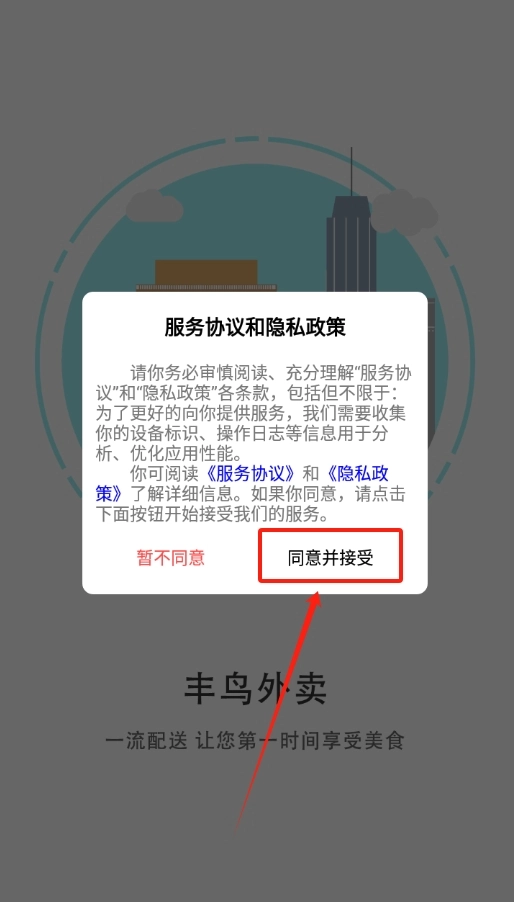 1、打开丰鸟外卖,一进界面就能看到软件协议,仔细看完没啥问题就直接点同意。