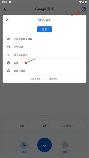 1、进入谷歌翻译器首页点击右上角进入,选择设置。