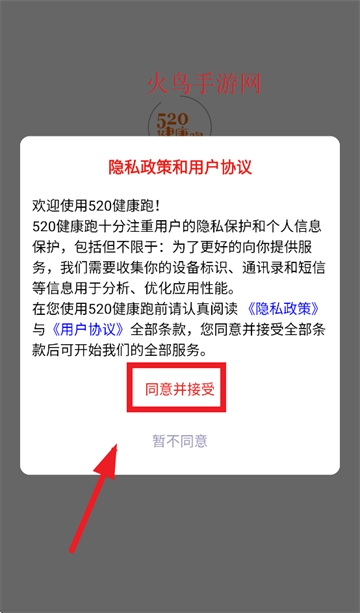 请先下载520健康跑app,完成安装后打开。打开应用时,需同意并接受隐私政策和用户协议。