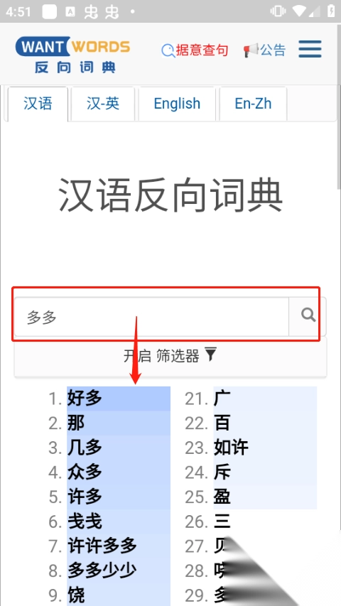 2. 点击搜索,随即我们就能迅速检索到各类相关词汇。