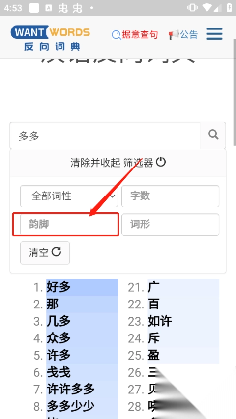 打开“筛选器”,在其中的韵脚区域输入韵母或声调