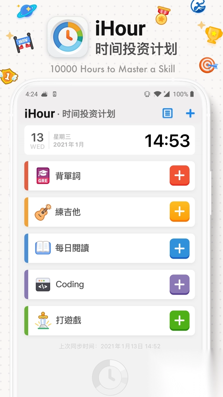 有一款 app,能助力你规划并记录自己的时间投入。它可以记录诸如“背单词几小时”“练琴几小时”“看书几小时”“Coding 几小时”这类需通过时间积累来提升的技能。该 app 独具每日定时提醒功能,配备事件正倒数计时器,还支持长达 10 年的时间规划。其特别设计的成就系统,能助你实现快速进步。