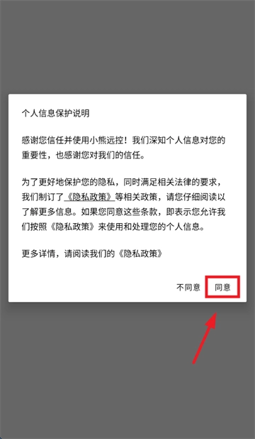 首先下载并安装小熊远控app,安装完成后打开该应用。打开应用时,会出现个人信息保护说明提示界面,需先同意此界面内容。