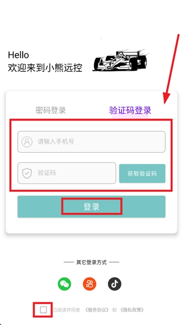 输入手机号,验证码,勾选已阅读并同意 《服务协议》 和 《隐私政策》,点击登录即可