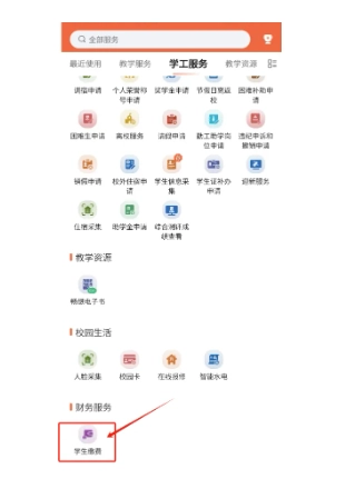 4、查找更多选项,点击“打开->学宿费”,进入该页面后,找到相应账单完成缴费操作即可。
