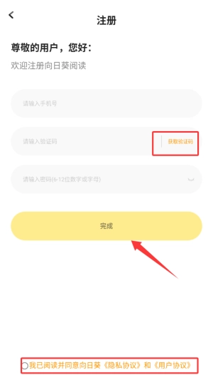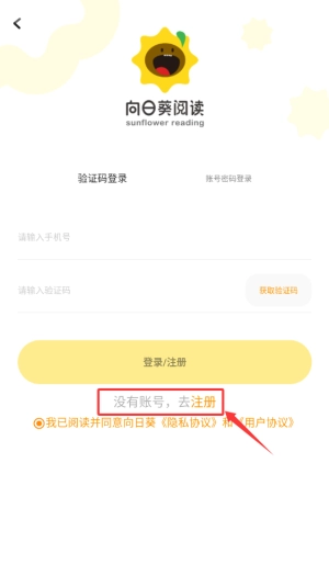 1、首次启动向日葵阅读APP时,系统会弹出登录界面,新用户需先完成注册流程。