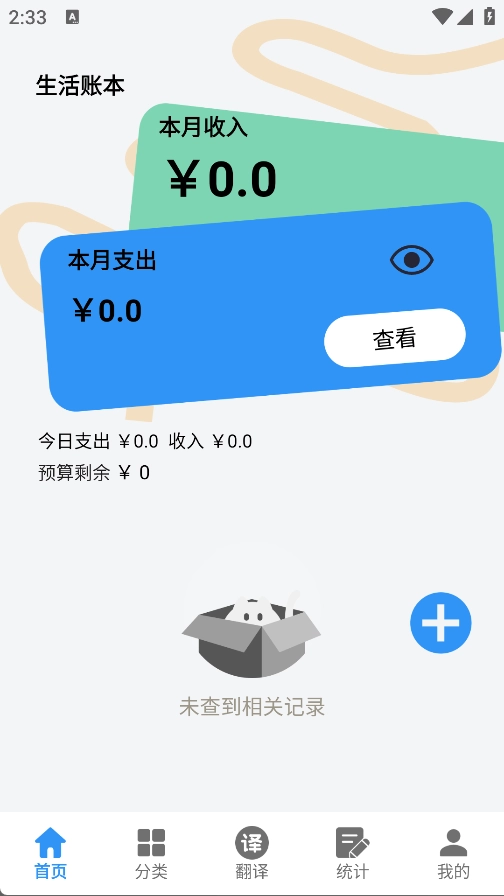 1、在首页中可以查看本月收入、本月支出以及今日支出的信息,还可以进行选择“+”号添加收入或支出信息;