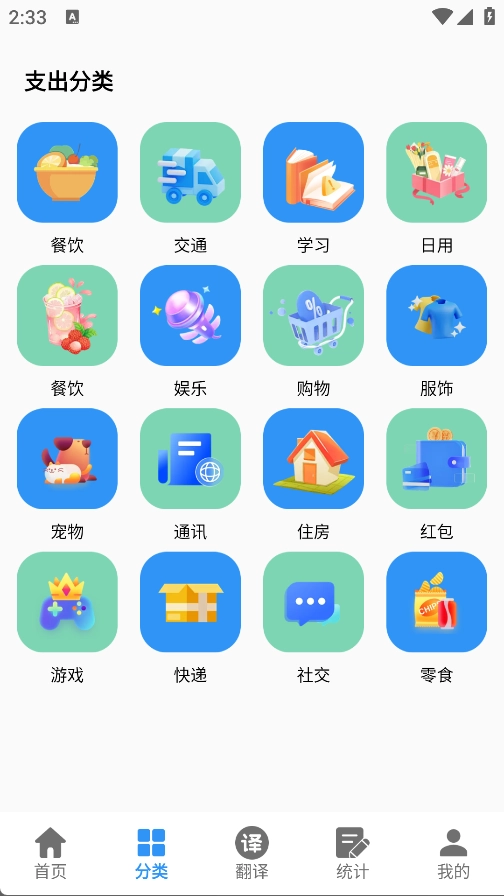2、在分类页面中可以了解各类不同的分类,按具体的分类进行记录支出,还可以查看这一类的支出详情;