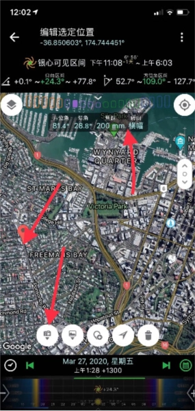 1、红点是选择好的机位,左下角的相机图标就是“选择拍摄点”。中间选择你的镜头焦距,我当时手里只有一只200mm。