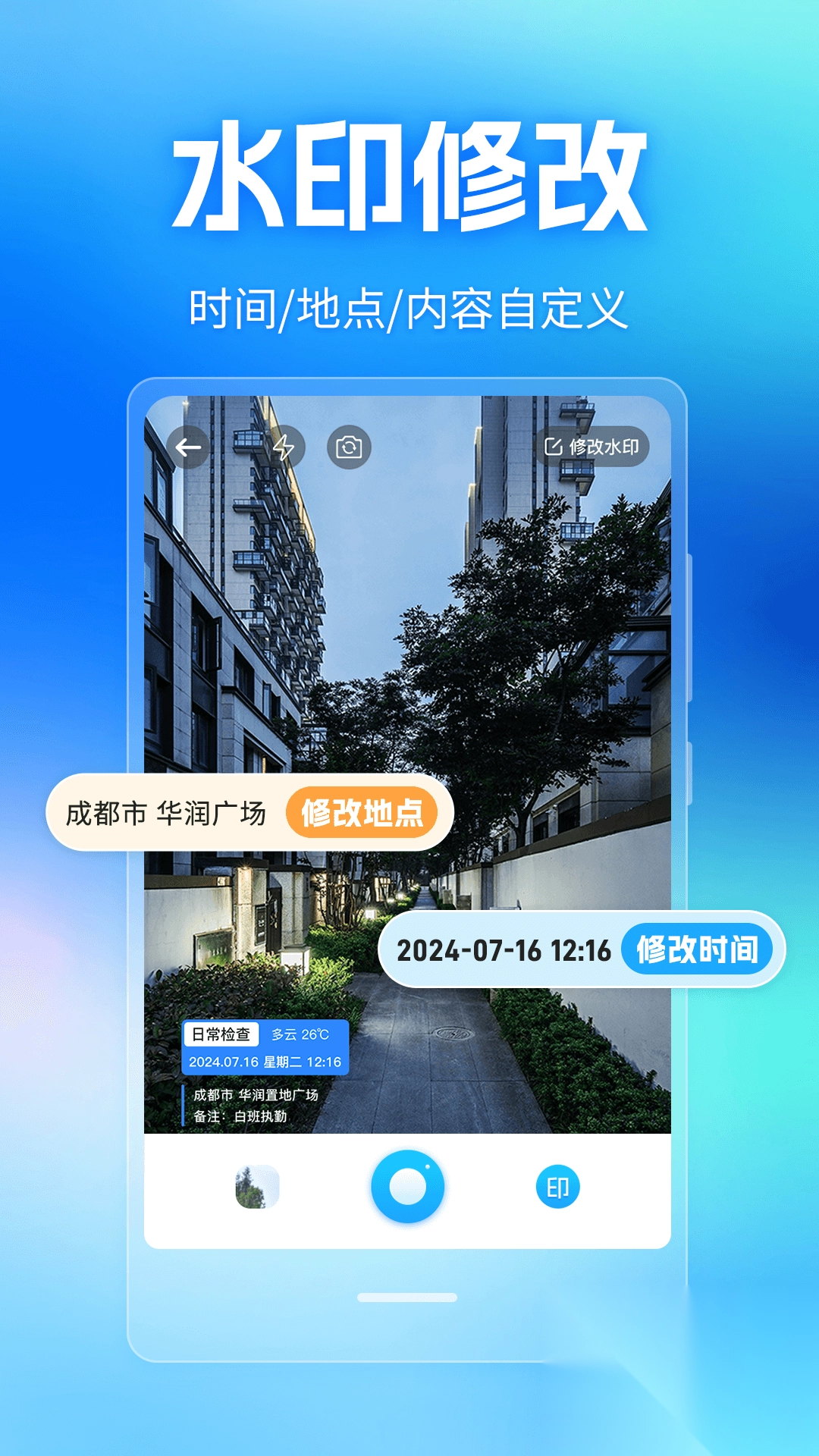 2、一键拍摄自带时间地点水印的现场照片,支持自由修改水印内容。