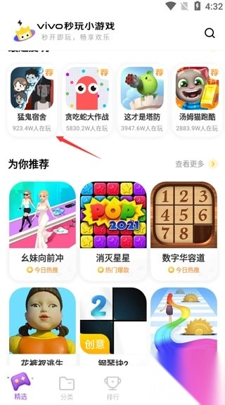2、在精选里,不管是最近热门的猛鬼宿舍,还是经典热游贪吃蛇大作战,亦或是最新上线的小游戏这里全都有;