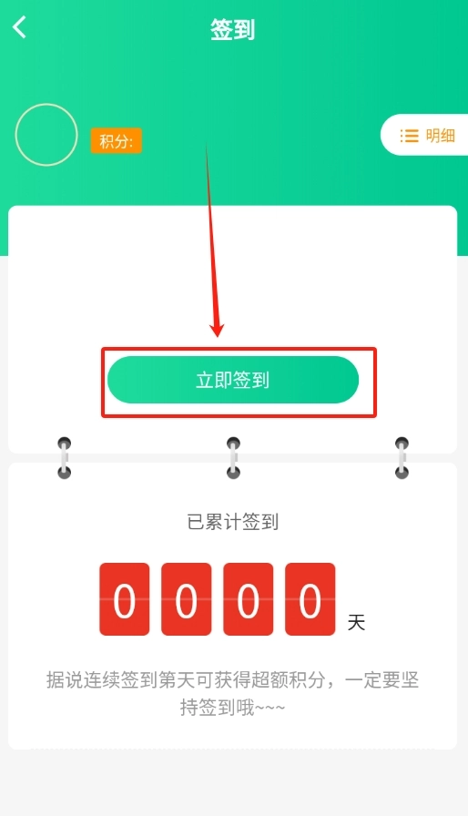3、进入签到页面后,会看到 “立即签到” 按钮,果断点击,即可完成签到操作。