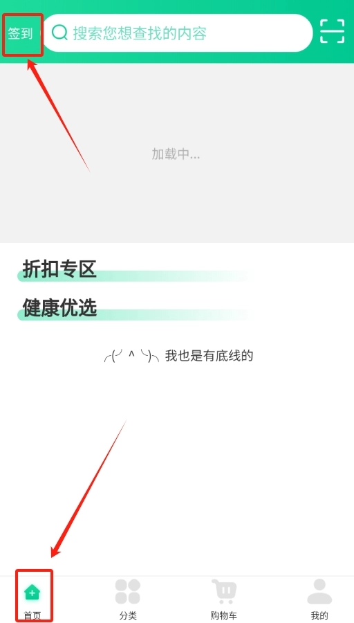 2、成功登录后,返回软件首页,在页面左上角位置,能看到 “签到” 标识,直接点击它。